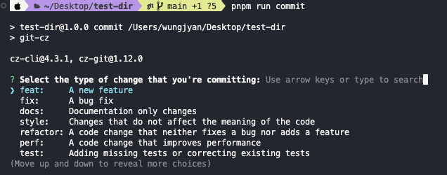 此时当你执行 pnpm run commit 后,就会发现终端中出现这样的选择式交互方式: